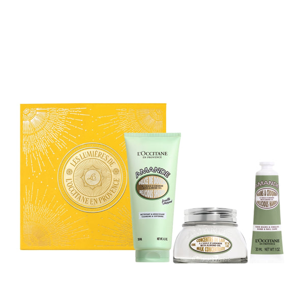 Успокойте тялото и ума си със сияещата сила на провансалските бадеми Всяка пролет равнините на Прованс се изпълват с розови и бели бадемови цветчета. Лабораториите на L'Occitane използват изключителната разкрасяваща сила на бадемовото масло със своето омекотяващо действие и концентрират подхранващите му свойства в невероятни продукти за тяло, които са едновременно изкусителни и ефективни. Те осигуряват дълготрайна хидратация, подобряват еластичността и видимо изглаждат кожата. Обогатени формули със сладко бадемово масло, подхранващи липиди, масло от гроздови семки, омега-3, омега-6 и омега-9 мастни киселини. Комплектът съдържа: Душ крем за тяло 200 мл, млечен концентрат 100 мл, крем за ръце 30 мл и лимитирана подаръчна кутия.