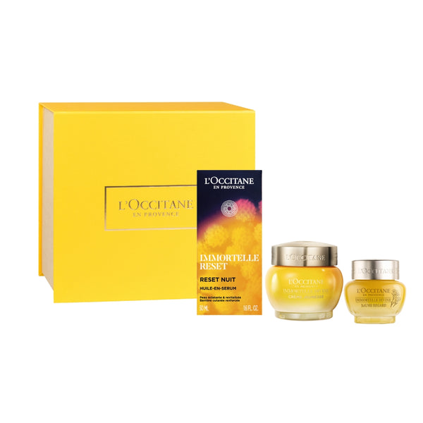 Комплектът съдържа: Двуфазен нощен серум 30 мл, божествен крем за лице 50 мл и божествен оклоочен балсам 15 мл.