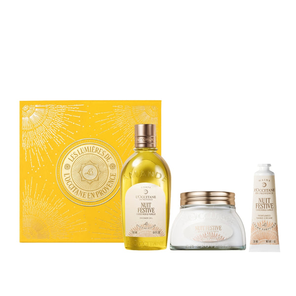 Nuit Festive - аромат с топли нотки на касис и ванилия. Вдъхновен от емблематичната линия с бадем, той оставя кожата мека и еластична. Перфектен от сутрин до вечер, ароматът остава върху кожата с нежно и трайно присъствие. Комплектът съдържа душ олио 250 мл, млечен концентрат 200 мл, крем за ръце 30 мл и лимитирана подаръчна кутия.