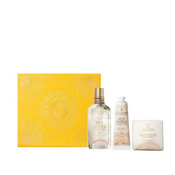 Nuit Festive - аромат с топли нотки на касис и ванилия. Вдъхновен от емблематичната линия с бадем, той оставя кожата мека и еластична. Перфектен от сутрин до вечер, ароматът остава върху кожата с нежно и трайно присъствие. Комплектът съдържа тоалетна вода 50 мл, крем за ръце 30 мл, ароматен сапун 50 г и лимитирана подаръчна кутия.