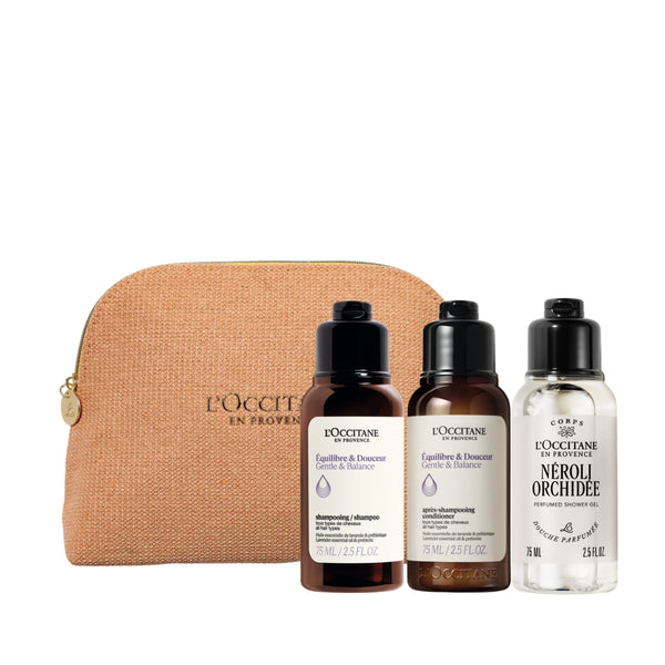 Търсите идеалния спътник за пътуване или подарък за любим човек? Този специален комплект от L’Occitane съчетава грижа за косата и тялото в удобен малък формат, който носи топлината на Прованс навсякъде с вас. Комплектът съдържа: Арома Нежен балансиращ Шампоан (75 мл), Арома Нежен балансиращ Балсам (75 мл), Душ гел Нероли и орхидея (75 мл) и лимитиран несесер.