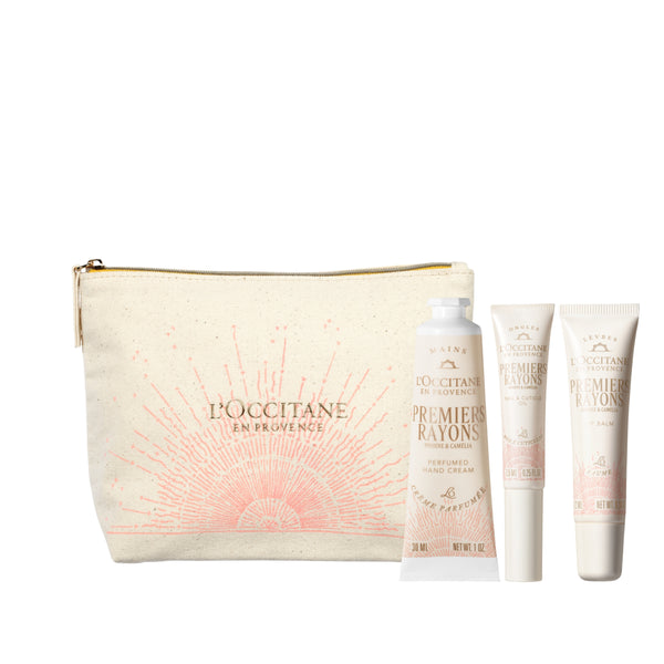 Premiers Rayons - нежен и сияен аромат с деликатни нотки на божур и камелия. Текстурите са изключително сетивни - оставяйки свеж, лек аромат, толкова утешителен, колкото първите утринни лъчи. Комплектът съдържа крем за ръце 30 мл, олио за кожички и нокти 7,5 мл, балсам за устни 12 мл и лимитиран несесер.
