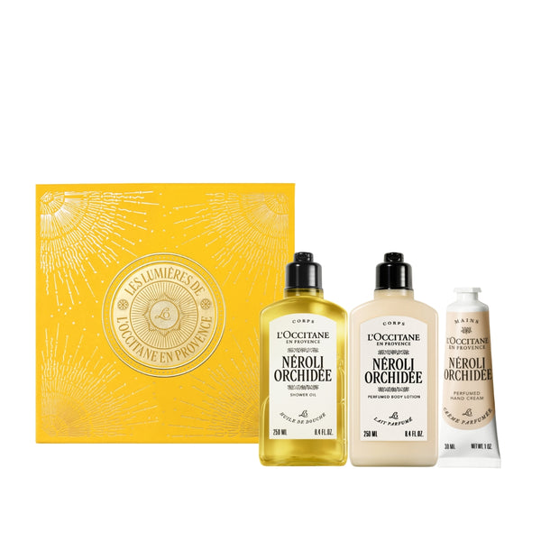 Колекцията Нероли и орхидея описва срещата на две скъпоценни съставки в Грас. Портокаловият цвят е част от пейзажа в Прованс, докато орхидеята носи уханието на далечни земи. Сега те са любовна двойка в един изключително женствен аромат. Комплектът съдържа душ олио 250 мл, лосион за тяло 250 мл и крем за ръце 30 мл.