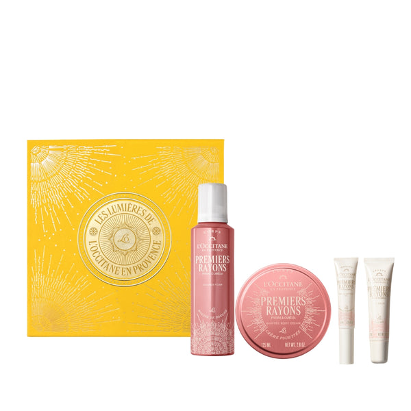 Premiers Rayons - нежен и сияен аромат с деликатни нотки на божур и камелия. Текстурите са изключително сетивни - оставяйки свеж, лек аромат, толкова утешителен, колкото първите утринни лъчи. Комплектът съдържа - душ пяна 200 мл, крем за тяло 125 мл, олио за кожички и нокти 7,5 мл и балсам за устни 12 мл.
