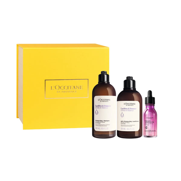 Комплектът съдържа: Нежен балансиращ шампоан 300 мл, нежен балансиращ балсам 250 мл и успокояващ серум за скалп.