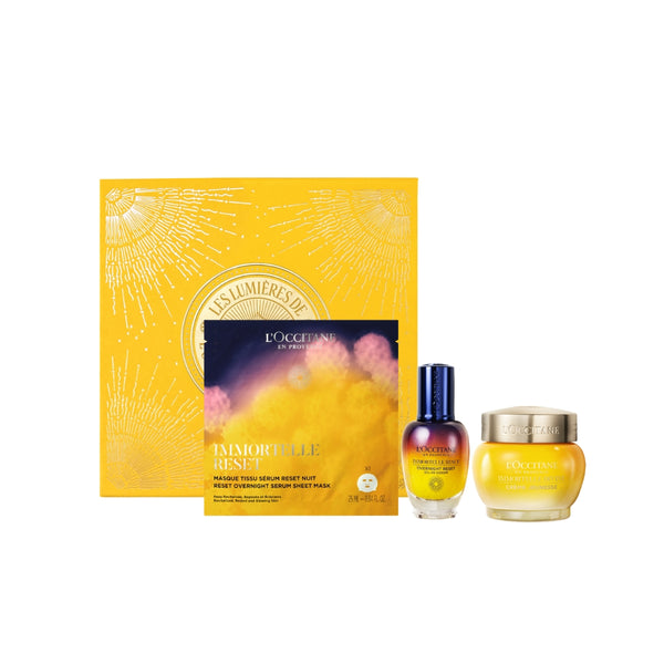 Комплектът комбинира двуфазен нощен серум, подхранващ крем с безсмъртниче и хидратираща маска за лице. Серумът е обогатен с екстракт от гардения и етерично масло от безсмъртниче, които успокояват кожата и помагат тя да изглежда по-гладка и сияйна още на следващата сутрин. Кремът с безсмъртниче има богата, копринена текстура и съдържа изключителна комбинация от съставки от безсмъртниче, включително суперекстракт – естествено извлечена алтернатива на ретинола, която подпомага подобряването на плътността и структурата на кожата. Формулата действа видимо върху бръчките, стегнатостта, жизнеността, равномерността на тена и обема на кожата.