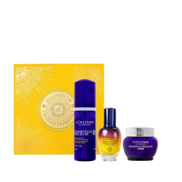 Комплектът включва почистваща пяна с безсмъртниче 150 мл, двуфазен нощен серум 30 мл, крем за лице с безсмъртниче 50 мл и подаръчна кутия.
