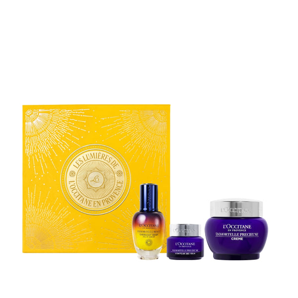 Погрижете се за кожата си с цялостна ритуална грижа, вдъхновена от силата на безсмъртничето. Промо комплектът съчетава нощно възстановяване, таргетирана грижа за околоочния контур и ежедневна хидратация за по-плътна, гладка и сияйна кожа. Формулите, обогатени с етерично масло от безсмъртниче и хиалуронова киселина, подпомагат еластичността, намаляват фините линии и видимите признаци на умора, като същевременно защитават от агресивните фактори на околната среда.